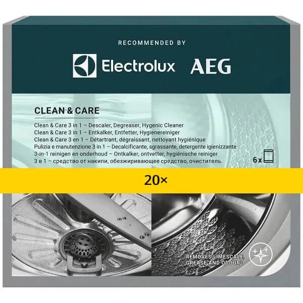Krabica (20x) Electrolux M2GCP601 čistič od výrobcu AEG/Electrolux – Clean&Care 3v1 na práčky a umývačky. Označenie čističa: M2GCP600 | M2GCP601 | M3GCP400 | M3GCP401 | M2GCP120 | M2GCP121 | M2GCP101